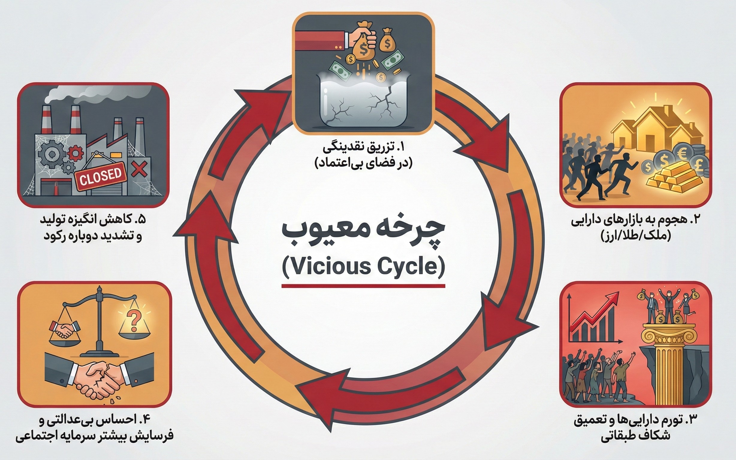 ۱. تزریق نقدینگی (در فضای بیاعتماد) ↓ ۲. هجوم به بازارهای دارایی (ملک/طلا/ارز) ↓ ۳. تورم داراییها و تعمیق شکاف طبقاتی