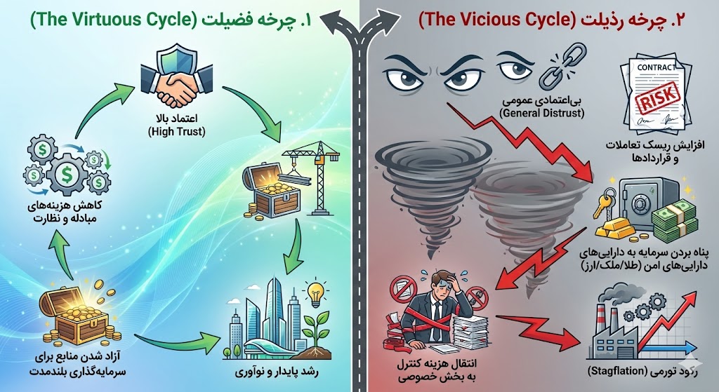 نکته: بحران اعتماد میتواند در قالب اعتماد افقی (بین افراد و بنگاهها) یا اعتماد عمودی (به نهادهای دولت و قانون) بروز کند؛ در عمل، همافزایی منفیِ این دو است که شدت جهش هزینه مبادله را تعیین میکند.