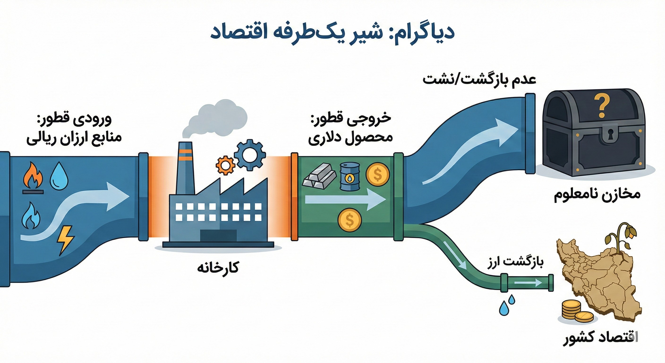 برای فهم این پارادوکس، اقتصاد ایران را مثل یک «شیر یکطرفه» تصور کنید؛ سیستمی که در ورودی، منابع را ارزان تزریق میکند، اما در خروجی، منفعت را با قیمت جهانی میفروشد و درست در نقطه بازگشت ارز به اقتصاد، نشت و ابهام شکل میگیرد.