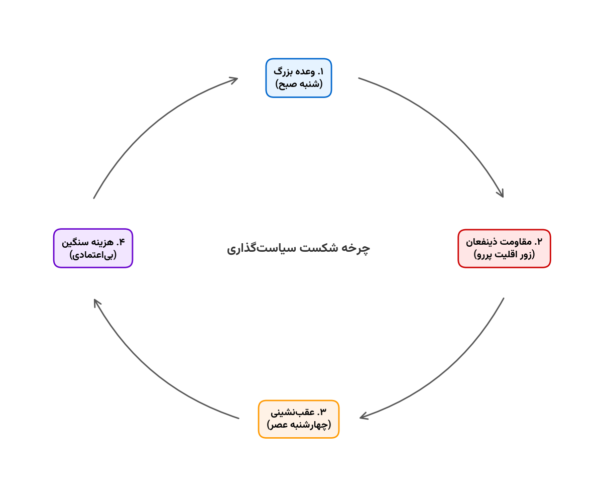 نمودار: چرخه معیوب سیاستگذاری؛ چگونه فشار ذینفعان و بیاعتمادی عمومی، وعدههای «شنبه صبح» را در «چهارشنبه عصر» شکست میدهد.