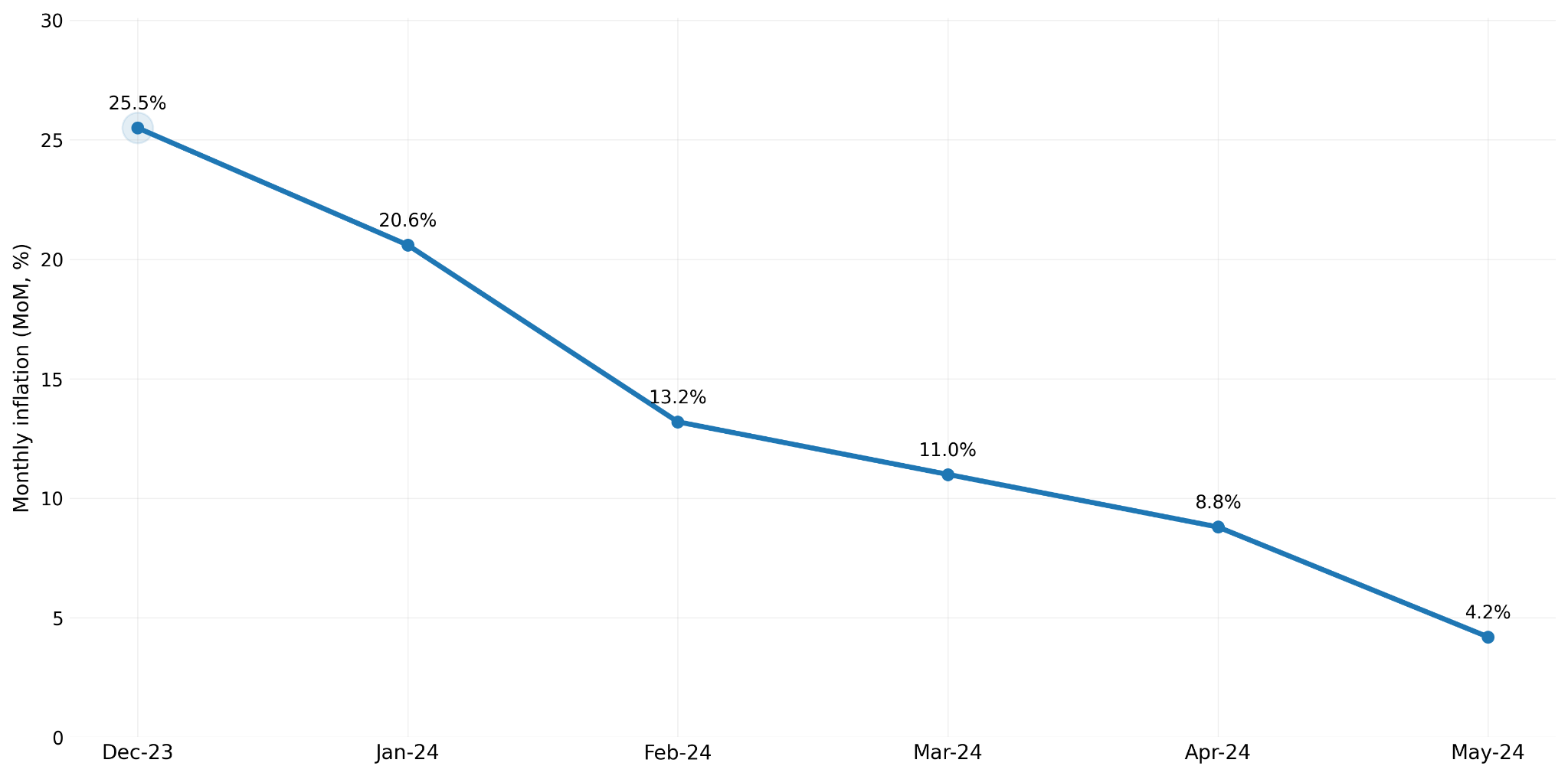 «آرژانتین؛ تورم ماهانه (درصد تغییر ماهانه CPI) از دسامبر ۲۰۲۳ تا مه ۲۰۲۴»