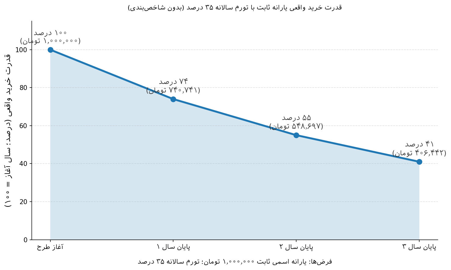 اگر تورم سالانه را ۴۰ درصد فرض کنیم، یارانه ثابتِ ۱ میلیون تومانی در پایان سال اول قدرت خریدی معادل ۷۱۴ هزار تومانِ امروز خواهد داشت و در پایان سال دوم به حدود ۵۱۰ هزار تومان میرسد. یعنی همان یارانه، بدون تغییر عدد، هر سال کوچکتر میشود. در این نقطه، تورم میتواند به «شریک خاموش» دولت بدل شود: کاهش ارزش واقعی تعهدات بدون اعلام رسمی. این همان منطق «مالیات تورمی» است: بخشی از هزینه عمومی از مسیر کاهش ارزش واقعی پول در دست مردم تأمین میشود، نه با مالیات آشکار.
