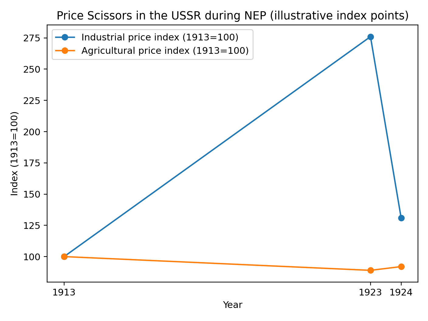 منبع داده: بازسازی بر اساس گزارشهای تاریخی/آماریِ دوره NEP که در ادبیات اقتصاد تاریخ شوروی نقل شده است (از جمله روایتهای استاندارد در تاریخ اقتصادی شوروی و بحثهای کلاسیک درباره “Price Scissors”؛ برای نمونه رجوع شود به آثار Alec Nove و نیز ادبیات تاریخی-اقتصادی مرتبط).