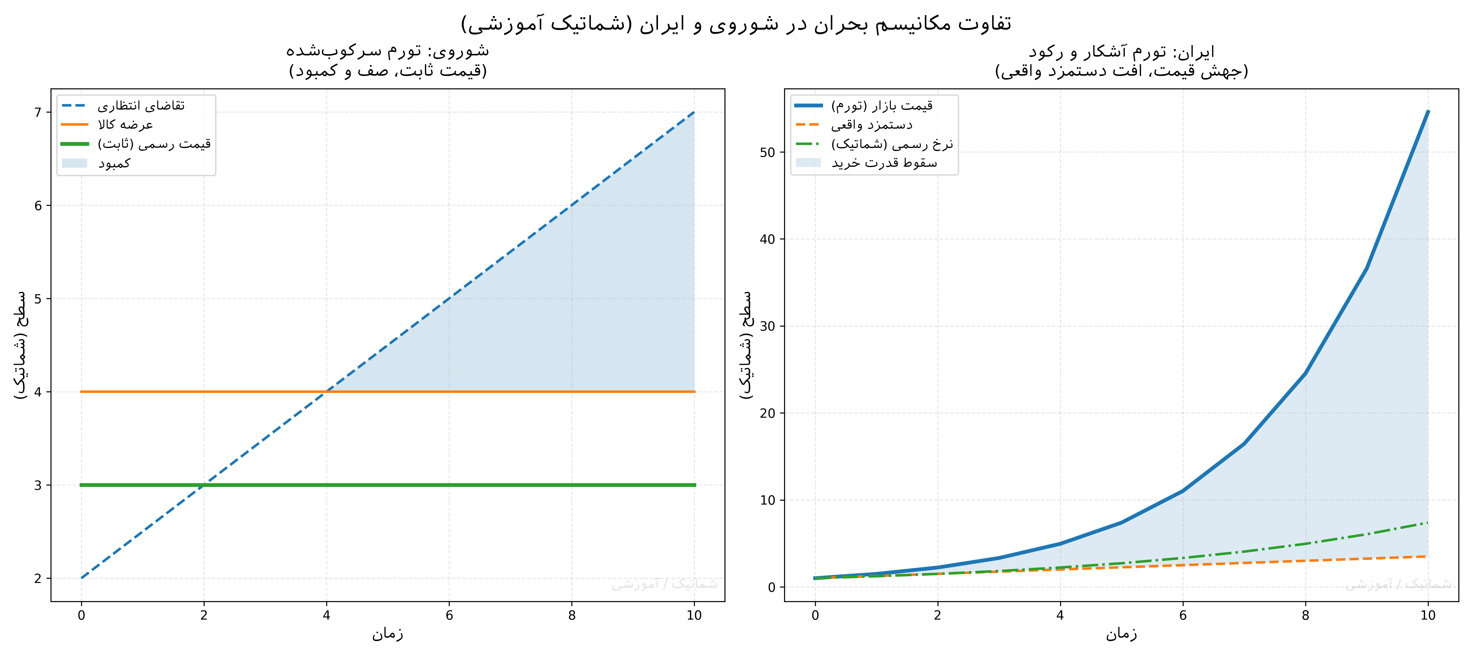 در ایران، مکانیسم غالب جهش قیمتها و نوسان ارزی است؛ کالا غالباً وجود دارد، اما قدرت خرید و افق اطمینان تضعیف میشود. کنترلهای قیمتی و مداخلات اداری نیز وجود دارد، اما هسته تجربه بحران، تورم آشکار است نه کمبود کالای فراگیرِ سیستماتیک. پیامد تجربه زیسته متفاوت است:
