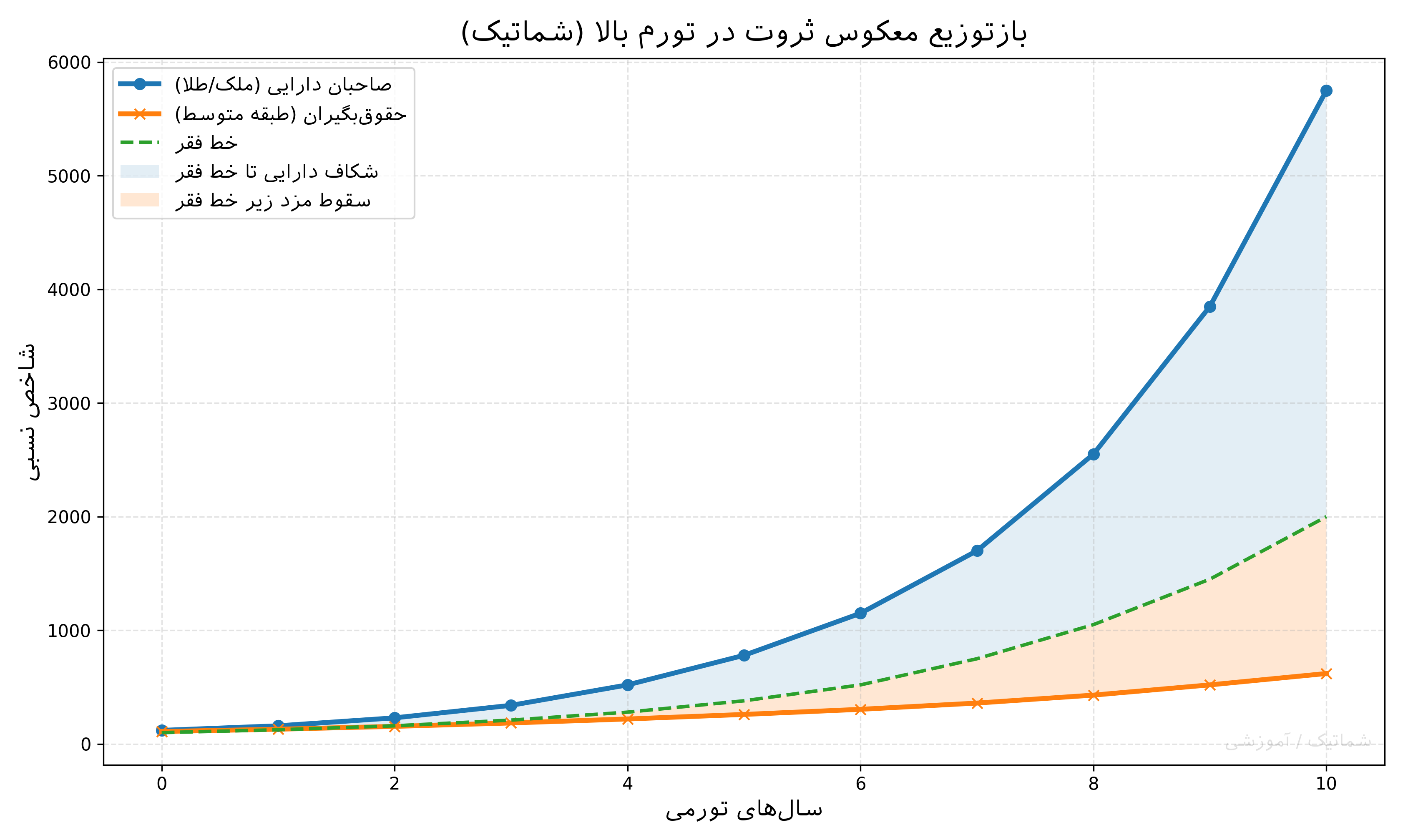 بازتوزیع معکوس ثروت در تورم بالا: در یک رژیم تورم مزمن، ارزش واقعی داراییها و دسترسی به پوششهای تورمی میتواند سریعتر از درآمدهای ثابت رشد کند و شکاف داراییداران و مزدبگیران را تشدید نماید؛ نتیجه، نزدیک شدن بخشهای بیشتری از طبقه متوسط به آستانه فقر و افت تحرک اجتماعی است.