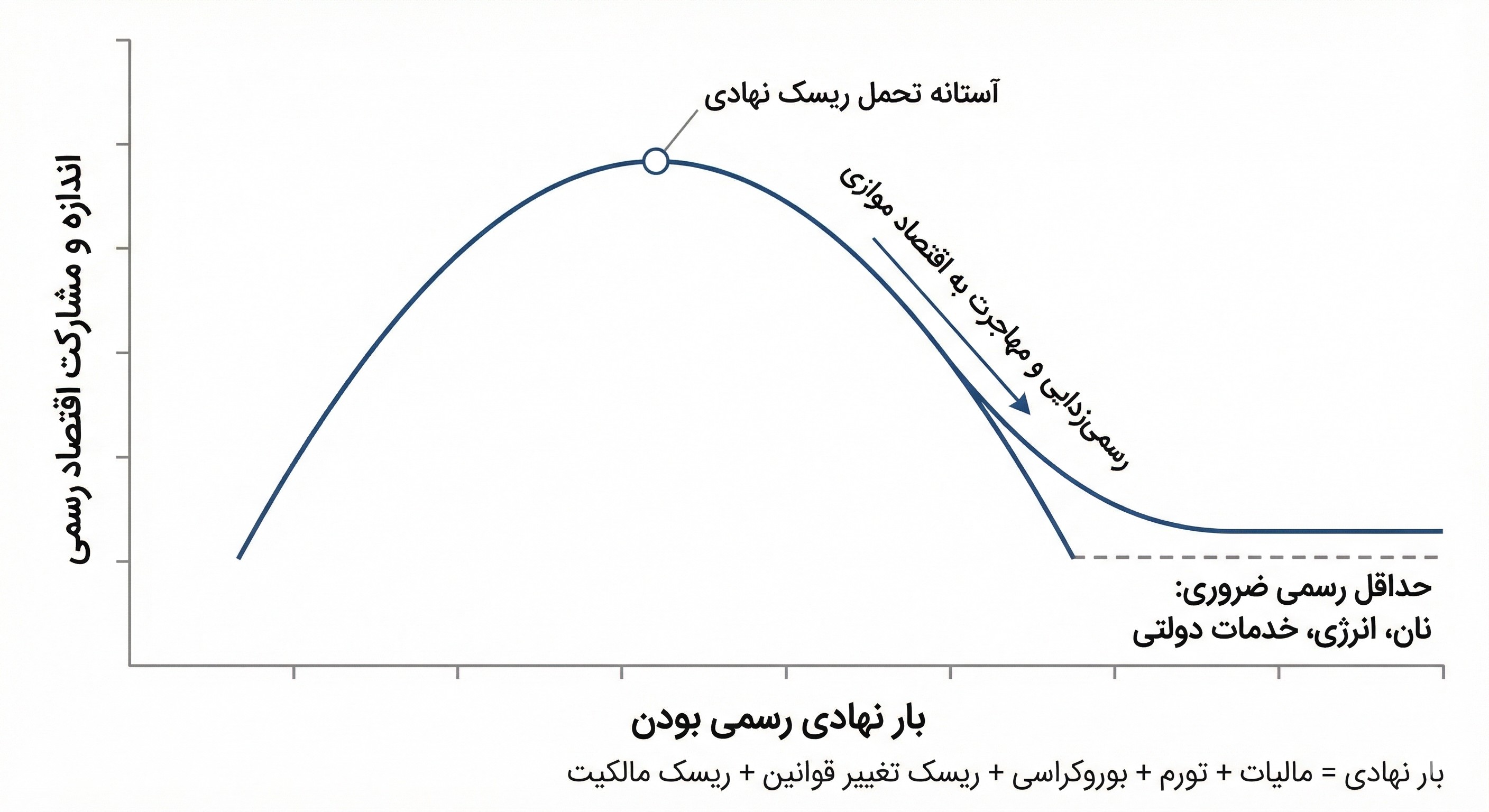 کپشن شکل ۱: منحنی هزینه نهادی نشان میدهد با افزایش بار نهادی رسمی بودن، مشارکت رسمی ابتدا افزایش و سپس پس از عبور از آستانه تحمل ریسک نهادی، کاهش مییابد. در اقتصاد ایران، وزن بالای ریسک تغییر قواعد، نااطمینانی مالکیت و تورم مزمن، اقتصاد را به ناحیه نزولی این منحنی رانده است؛ بهگونهای که فشار نهادی بیشتر به رسمیزدایی و مهاجرت ابزار پرداخت منجر میشود.