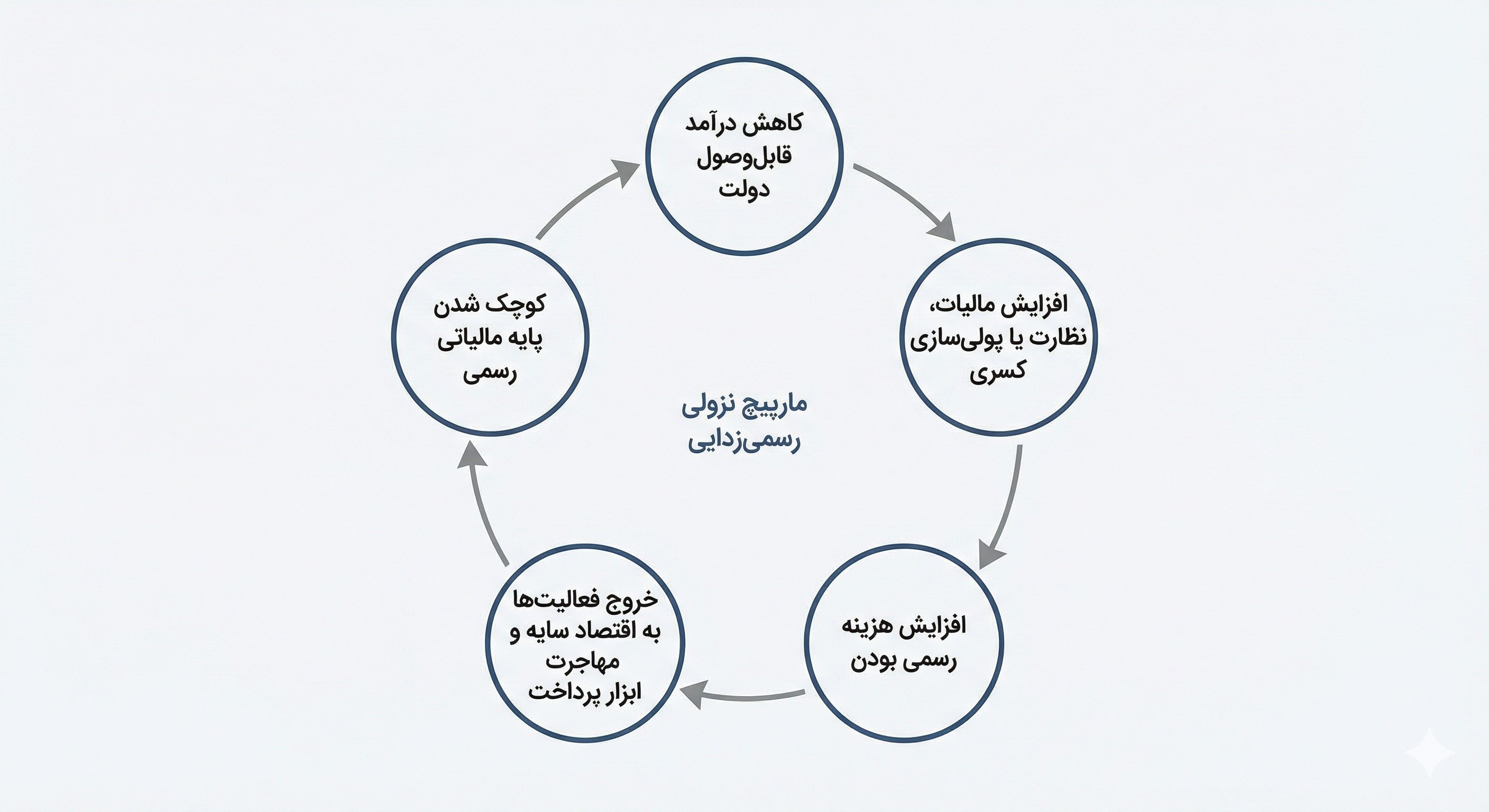 ترکیب کوری آماری و اثر بومرنگی سیاستها، یک چرخه خودتقویتشونده ایجاد میکند: کاهش درآمد قابلوصول دولت، افزایش فشار مالیاتی یا پولیسازی کسری، افزایش هزینه رسمی بودن، خروج بیشتر فعالیتها به سایه، کوچکتر شدن پایه مالیاتی رسمی، و بازگشت به گام نخست. این چرخه همان مارپیچ نزولی رسمیزدایی است. هرچه دولت برای جبران کسری خود فشار بیشتری بر بخش قابل رؤیت وارد کند، انگیزه خروج به سایه قویتر میشود. این مارپیچ اگر متوقف نشود، به تدریج اقتصاد رسمی را به یک هسته کوچک اداری-حقوقبگیری تقلیل میدهد.
