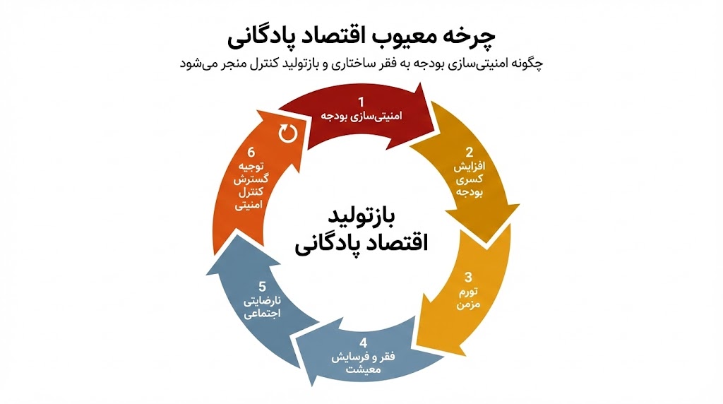 امنیتیسازی بودجه → افزایش هزینههای جاری غیرمولد → کسری بودجه ساختاری → تأمین کسری از مسیر چاپ پول و سرکوب مالی → تورم مزمن → کاهش قدرت خرید → سقوط سرمایهگذاری → استهلاک زیرساخت → افت تولید بالقوه → فقر پایدار → نارضایتی اجتماعی → توجیه امنیتیسازی بیشتر