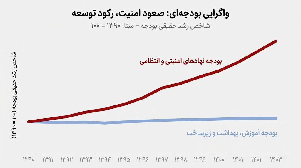 در دهه ۱۳۹۰ و ورود به دهه ۱۴۰۰، حتی بدون ورود به برآوردهای فرابودجهای، یک الگوی مشخص در بودجه عمومی دیده میشود: رشد حقیقی ردیفهای مرتبط با نهادهای نظامی، انتظامی، امنیت داخلی، رسانههای حکومتی و زیرساختهای نظارتی، بهطور مستمر بالاتر از رشد حقیقی بودجه آموزش، بهداشت، محیط زیست و عمران بوده است. این واگرایی نه یک پدیده تکساله، بلکه یک روند چندساله است.