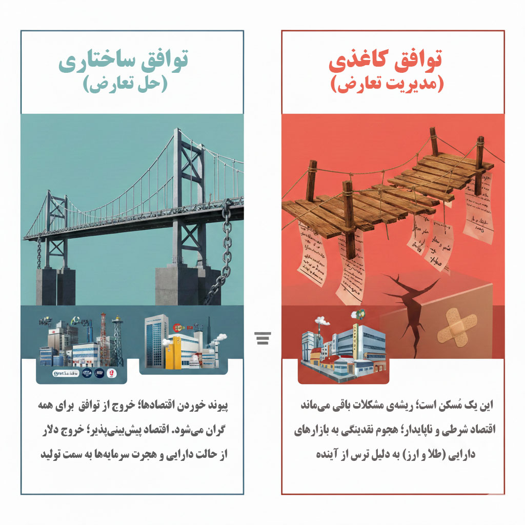 تجربه برجام سطح بیاعتمادی ساختاری را افزایش داد. خروج یکجانبه آمریکا و واکنشهای متقابل، سیگنالهایی درباره شکنندگی تعهدات ارسال کرد که اثر آن فراتر از خودِ توافق بود. واقعیت این است که بازارها به خودِ توافق واکنش پایدار نشان نمیدهند، بلکه به احتمال بقای توافق قیمتگذاری میکنند. به همین دلیل است که تا وقتی سرمایهگذار حس نکند این توافق «برگشتناپذیر» است، پولش را به جای تولید، در داراییهای امن پناه میدهد.